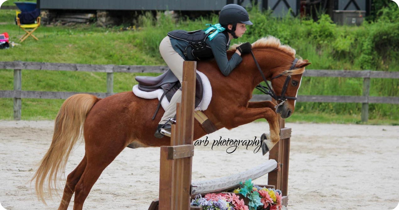 My main pony is Reese’s Pieces — or “Reese” for short. He’s a small chestnut pony who used to have a bit of a naughty streak. He’d dump people, but I worked that out of his system! I started taking him to the Derby at the Vineyard shows for experience, and we actually won that year. Since then, we’ve moved up divisions, gone to Zone 2 Finals in Harrisburg, M&S finals in Saugerties, and now we’re working toward qualifying for Pony Finals. It’s amazing to see how far he’s come.